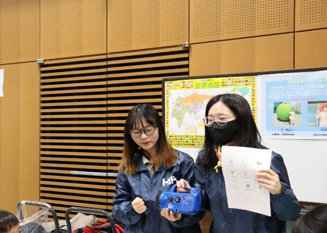 国際交流員(中国と韓国出身)が、子どもたちを対象に簡単な中国語、韓国語と英語を交えてプログラムを行い、日常的に災害に備えることの重要性をPRしました。また、国際交流員の出身国(中国・韓国)についても簡単に学びました。